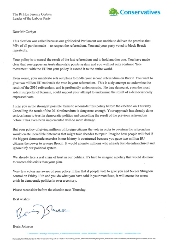 The Prime Minister has written a letter urging Jeremy Corbyn to reconsider his Brexit policy and his plans to fiddle Labour’s second Brexit referendum.