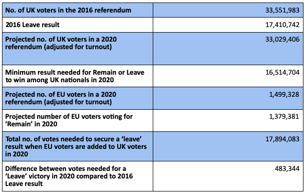 Academic research suggests that 90% of these new voters would very likely back remain - applying this to the likely turnout in a second referendum means that leave could need to win nearly 500,000 more votes than it did in 2016 if it is to win again.