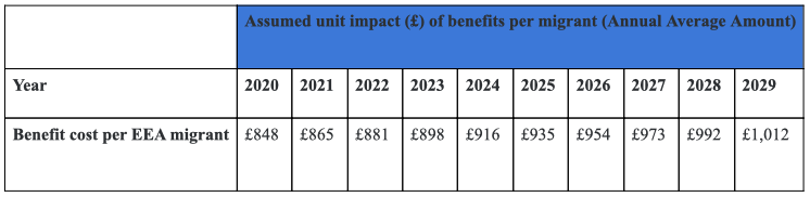 We have modelled what the impact would be on the total cost of benefits for these migrant flows, set out below. The average cost per migrant does not assume that every migrant is a benefit claimant, but is used as a statistical tool to give an average of the total across the total migrant population. This analysis looks at the impact on the DWP budget exclusively, not at other economic impacts.