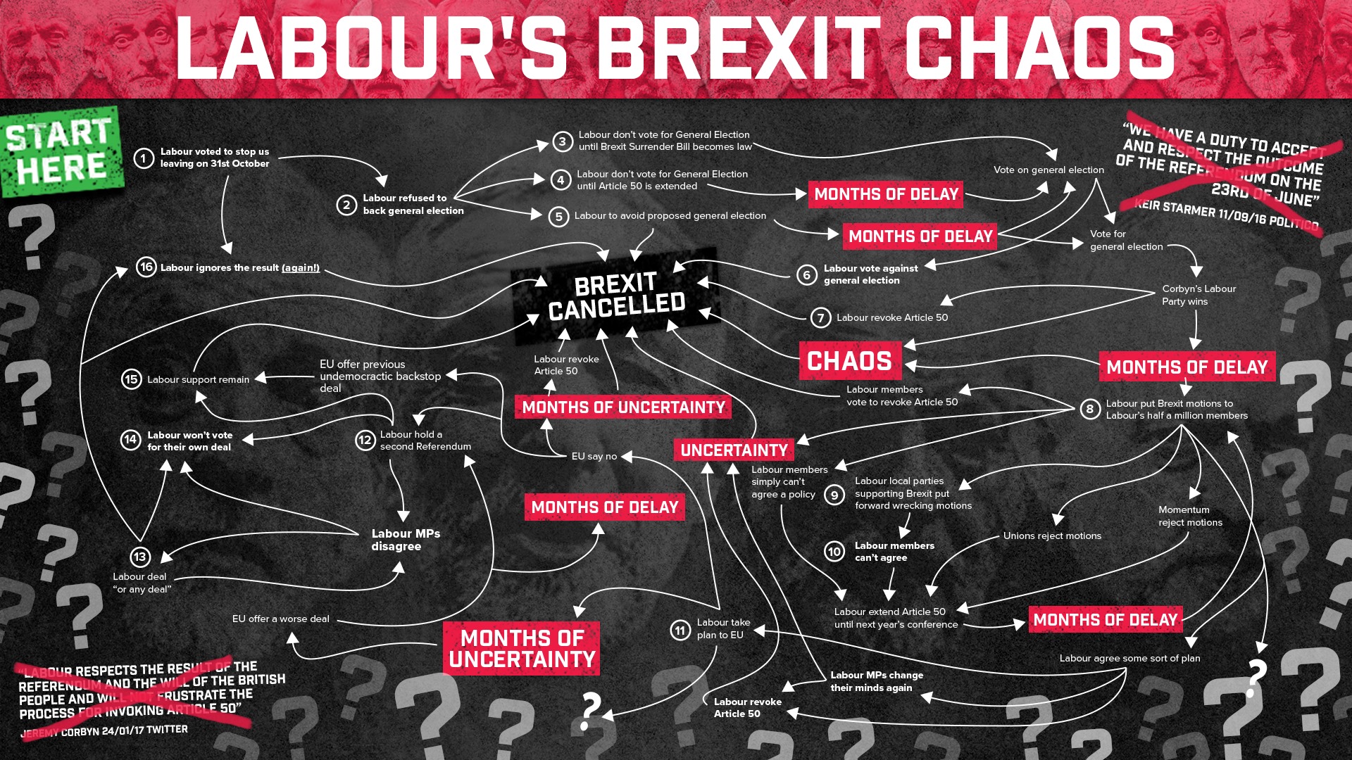 Jeremy Corbyn promised to respect the country’s decision to leave, but is now supports re-running the referendum which would take us all back to square one.